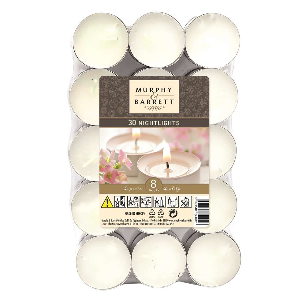 Murphy & Barrett's 8-hour nightlights deliver consistent, reliable illumination throughout the evening. This 30-piece pack offers excellent value for households seeking dependable ambient lighting without fragrance.