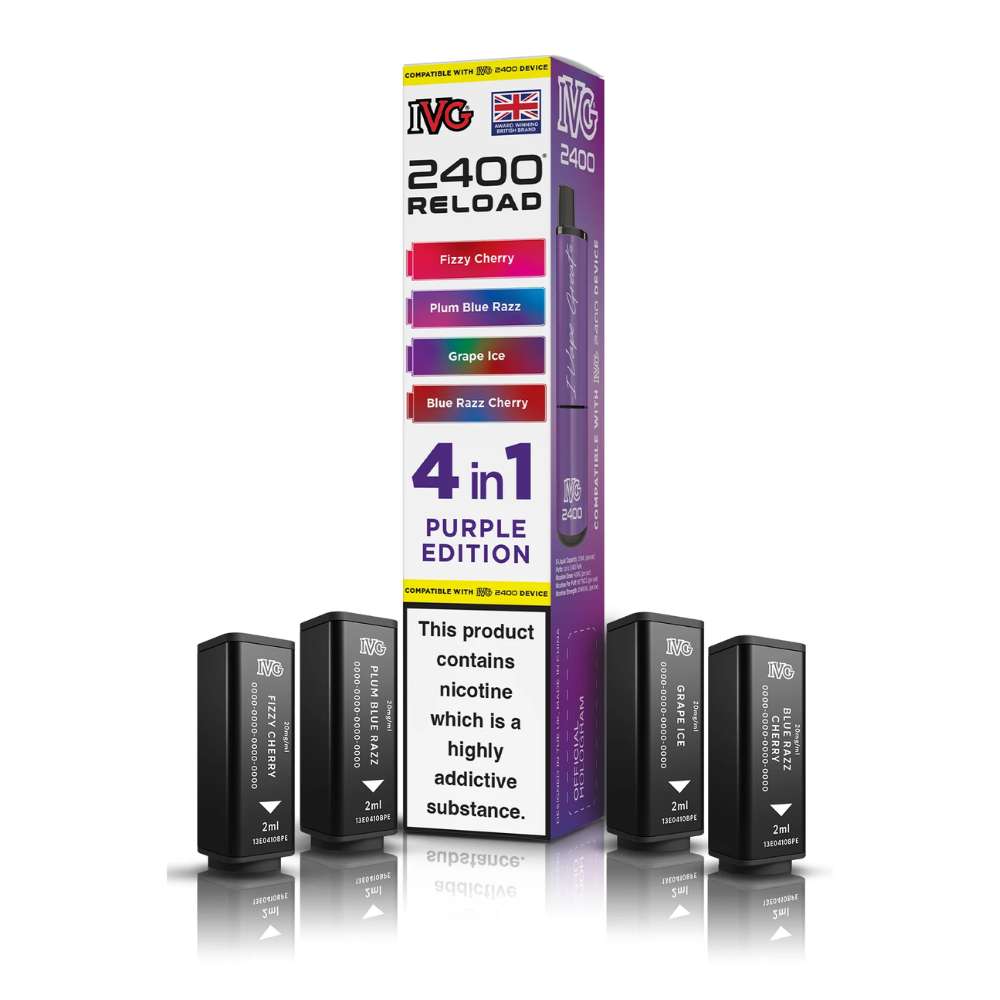 Keep your IVG 2400 4-in-1 rechargeable device bursting with flavour using the Purple Edition Reload Pods, featuring four vibrant flavours: